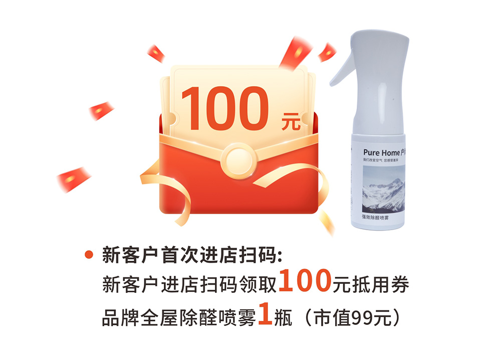 新客户进店扫码领取100元抵用券+品牌全屋除醛喷雾1瓶(价值99元)