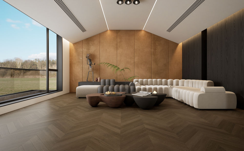 “人”字韵律: 人字拼利用标准的长方形地板,通过45度的交错排列,形成连贯的“人”字形图案。这种铺设方式在保留了鱼骨拼的动感和视觉趣味的同时,大大降低了材料损耗和施工难度。