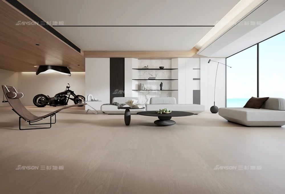微米级涂层:橡木的原始肌理完整保留,拒绝“油漆埋木”的厚重虚假。光线漫射下,地板呈现柔和哑光质感,如丝绸般低调奢华。